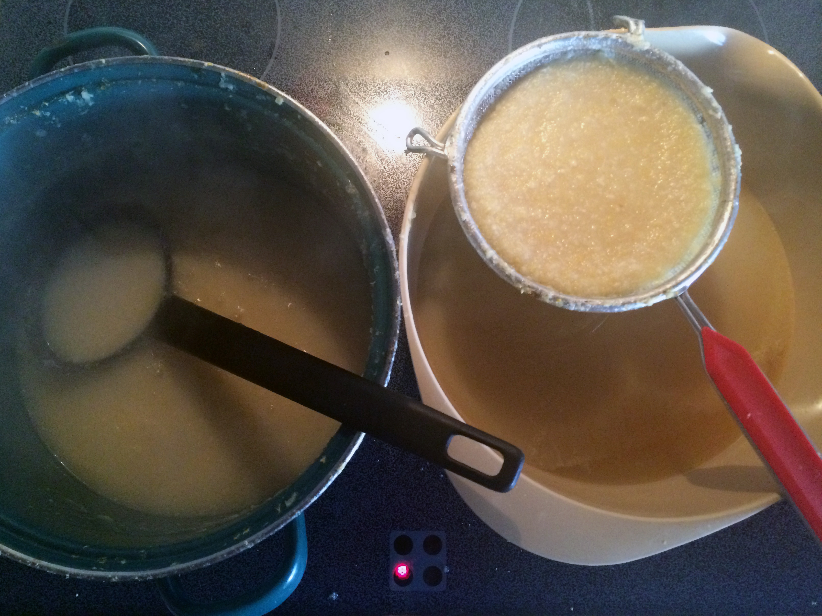Zitronen-Knoblauch-Sud beim 1. Sieb-Vorgang