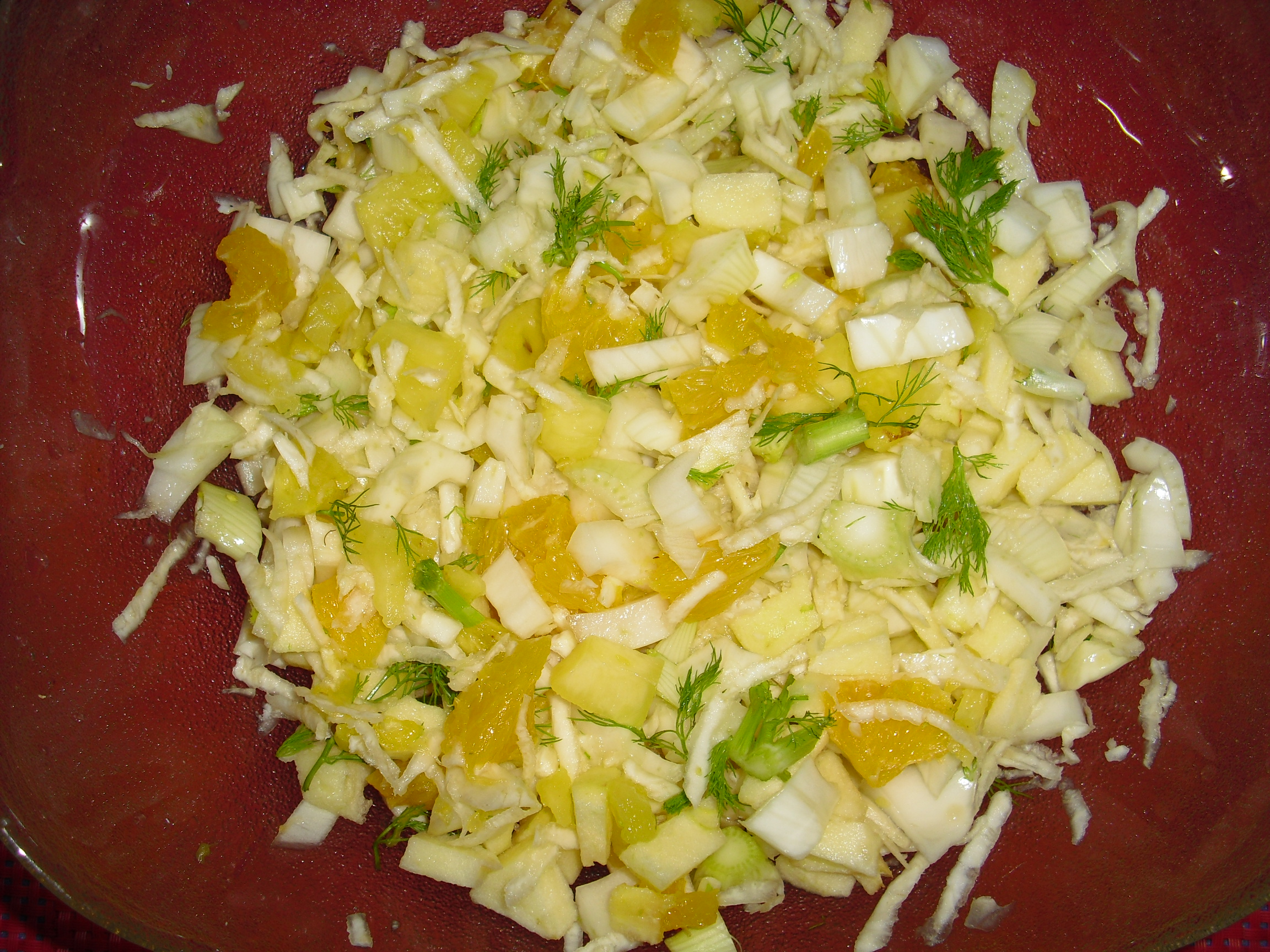 Mein Fenchel-Selerie-Orangen-Ananas-Apfel Salat. Schmeckt wunderbar frisch und saftig, ist gesund und voll mit Vitaminen. Meine eigene Kreation