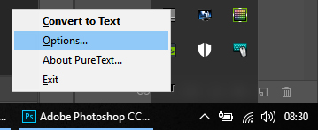 Nach der AusfĂŒhrung des Tools findet man unten rechts in der Taskleiste das Symbol PT fĂŒr PureText. Dort kann man per Rechtsklick die Vorkonfiguration durchfĂŒhren.