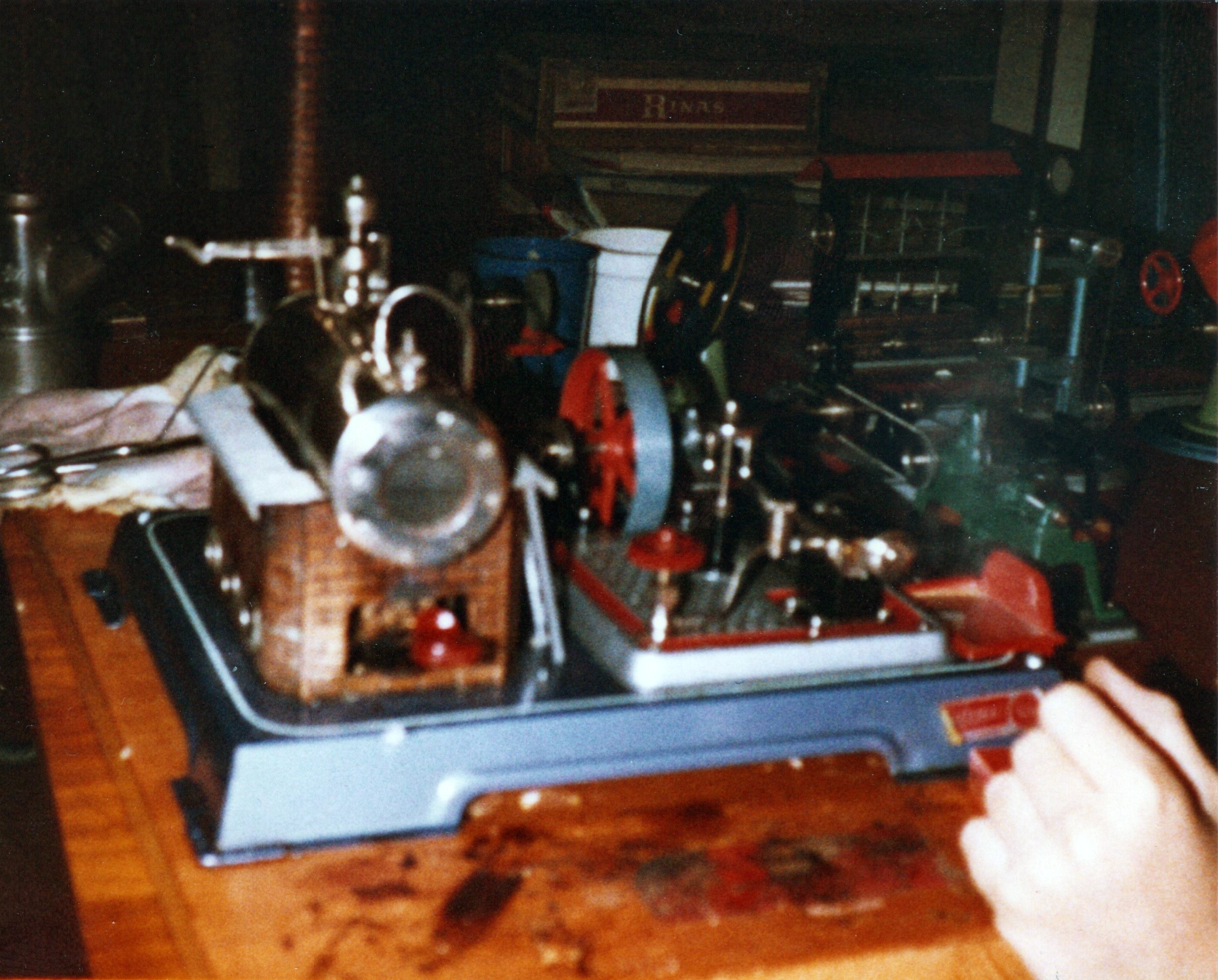 Diese Dampfmaschine funktionierte mit einem Esbit-Brennstoff-Ofen und hatte einen Zylinder mit Schwungrad und diversen Maschinen, wie eine Säge, ein Hammerwerk, und vieles mehr.