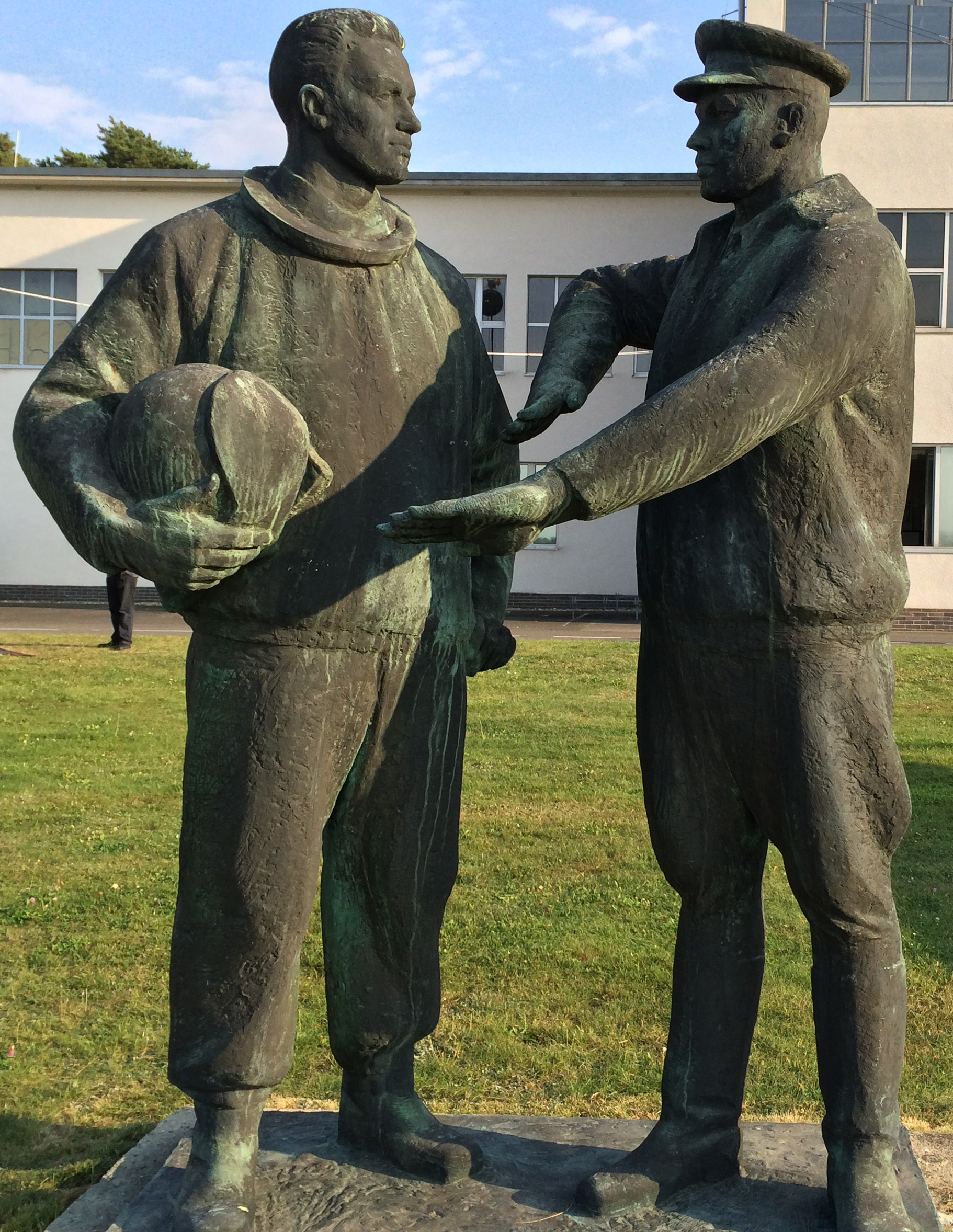 Dass sich hier zwei Piloten unterhalten, ist unschwer zu erkennen: Mit demonstrativen Handgesten erklĂ€rt ein sowjetischer Pilot (rechts) einem NVA-Piloten (links) ein Flugmanöver. Der Slogan âVon der Sowjetunion lernen heiĂt Siegen lernen" wird somit auf die LuftstreitkrĂ€fte ĂŒbertragen. Die beiden Skulpturen sind nur auf den ersten Blick lebensgroĂ. Erst wenn der Betrachter nĂ€her an sie herantritt, bemerkt er, wie klein er selbst im VerhĂ€ltnis zu den Piloten ist. Mit einer KörperlĂ€nge von 2,5 m und einer Schulterbreite von jeweils gut 80cm (Ellenbogen zu Ellenbogen: 1,12 m), den kantigen Gesichtern und muskulösen Armen ĂŒberragen sie ihr Umfeld und strahlen StĂ€rke aus.