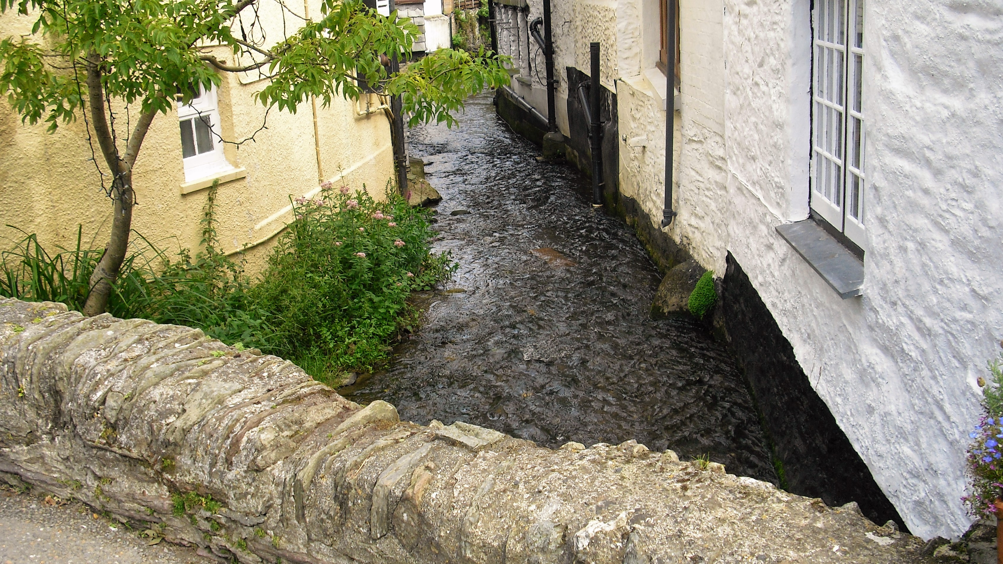 Polperro. Unter der Brücke am Hafen kommt der kleine Fluss Pol heraus, der bei Polperro im Ärmelkanal mündet.