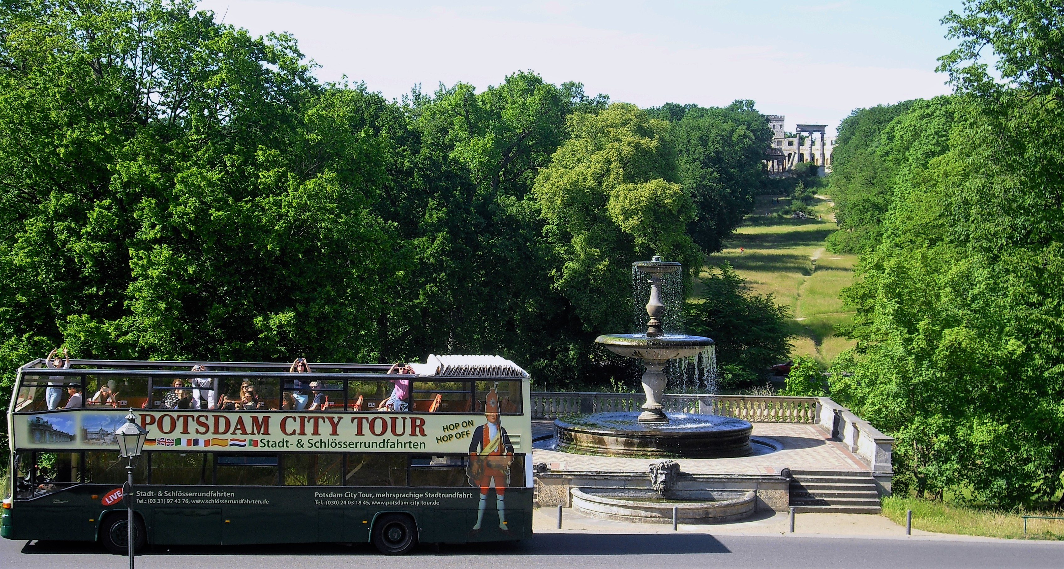 Vom Ehrenhof Schloss Sanssouci, die Sicht über den Rossbrunnen(von Friedrich Wilhelm IV. Viehtränke genannt) und Kaskade an der Straße nach Bornstedt, zum Ruinenberg.