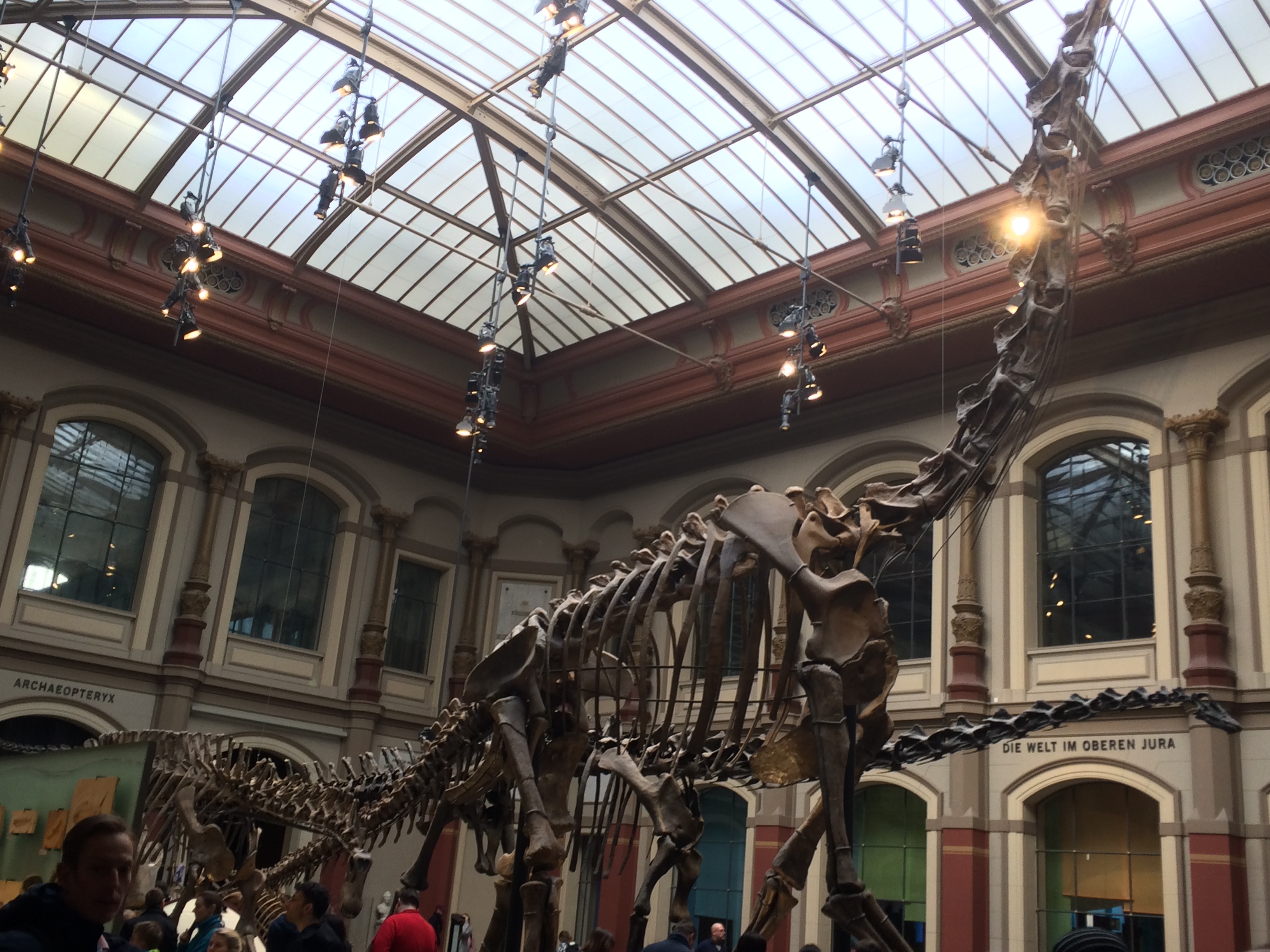 A giant of the time was the herbivore dinosaur Brachiosaurus with the gigantic proportions: as high as a four-story house and as heavy as ten elephants. He moved at a speed of 5 - 17 km / h At 15.50 meters long and 13.27 meters high, this specimen is the largest constructed dinosaur skeleton in the world. The animal weighed about 50 tons before his death. The front legs were longer than the hind legs. So the animals with their long necks could reach the branches high up in the treetops. The head of the animal is very small in relation to the body, he could not chew his food with his spatulated teeth, instead he bit off branches and swallowed them uncorrupted. He was probably fed on conifers.