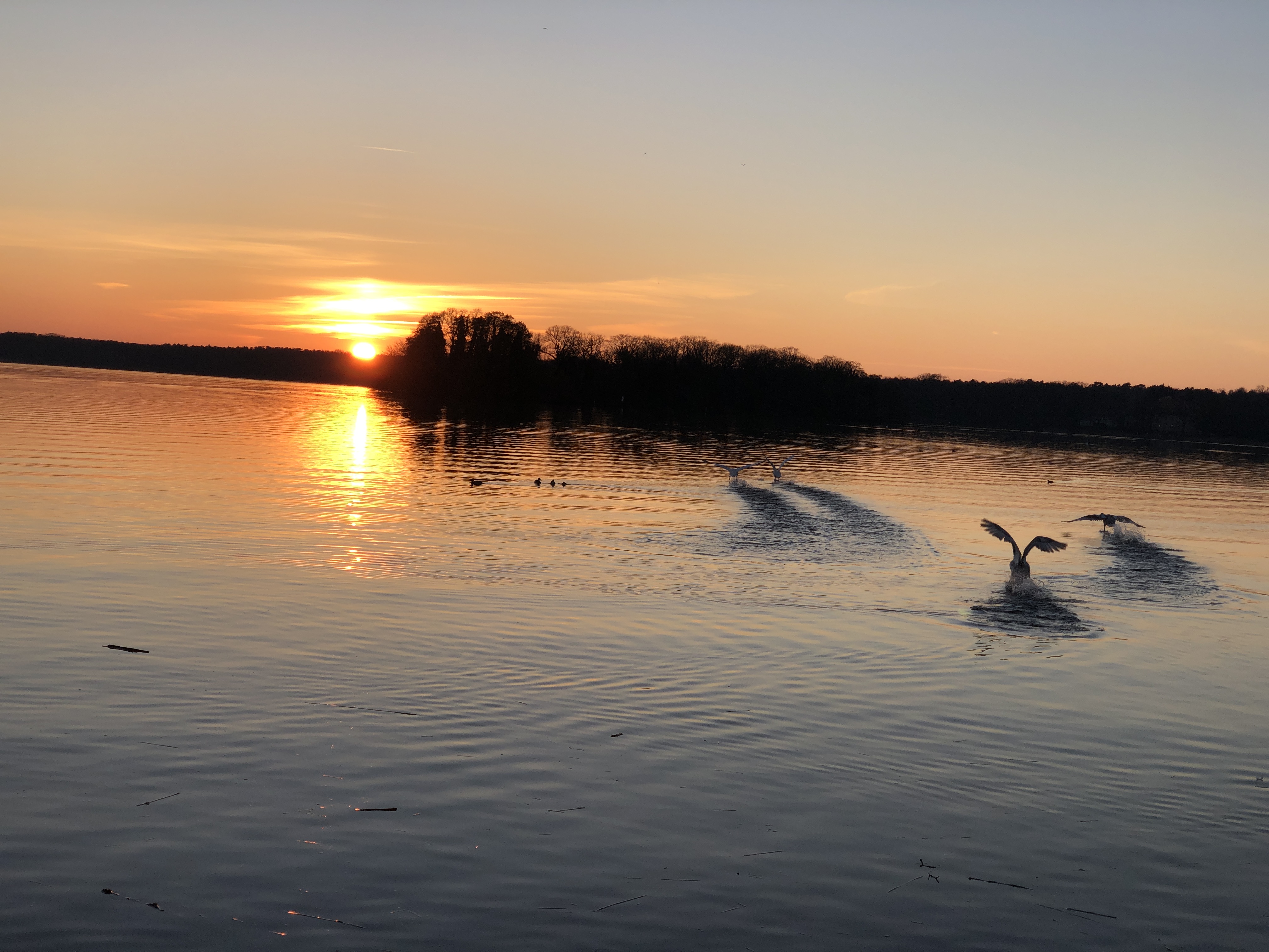 Herrlich, die Schwäne anzuschauen, die grade vom Wasser starten und in den Sonnenuntergang fliegen. Hier ist die Welt noch in Ordnung.