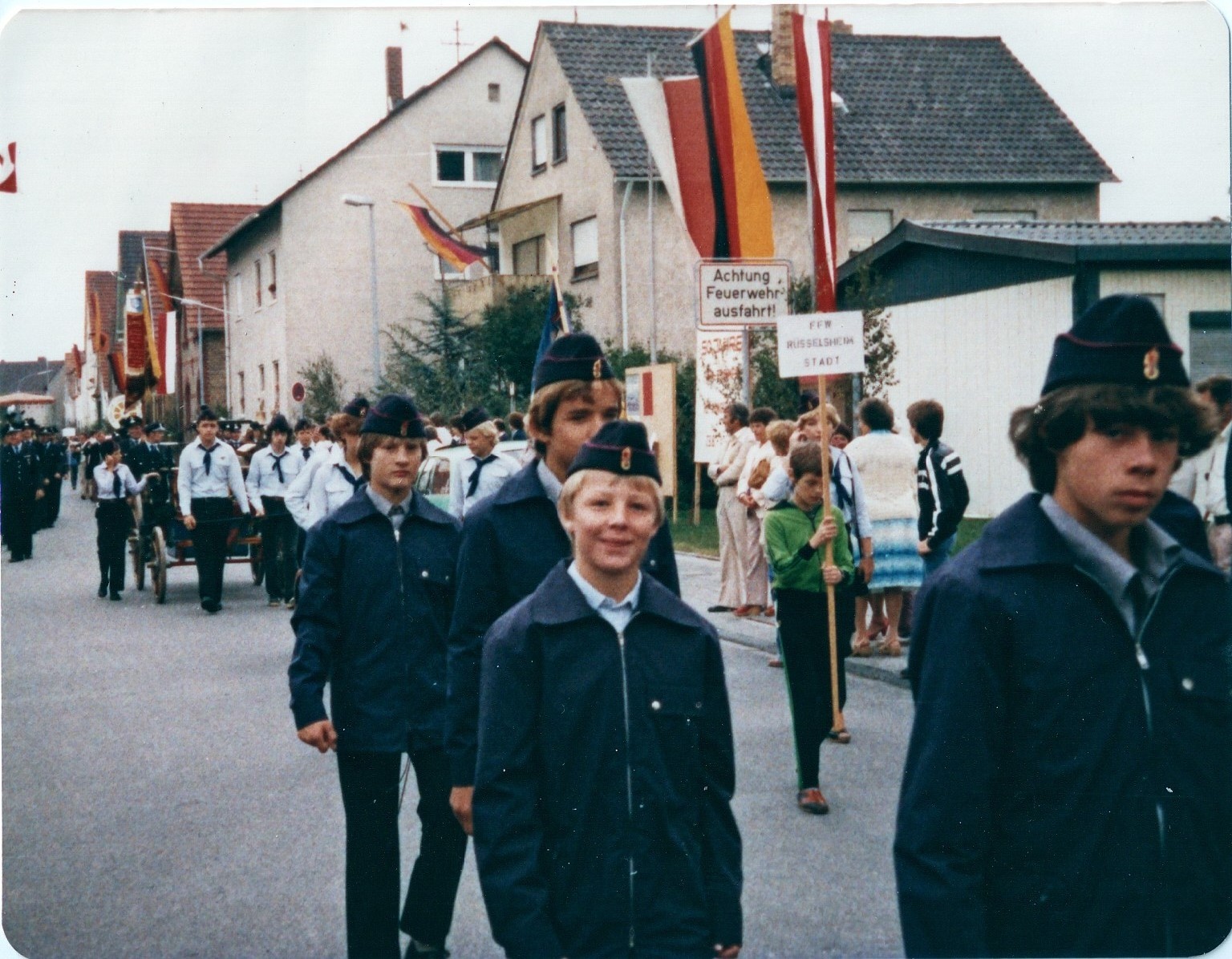 Umzug der Jugendfeuerwehr Nauheim beim Feuerwehrfest 1980 der Freiwilligen Feuerwehr Königstädten in Rüsselsheim-Königstädten.